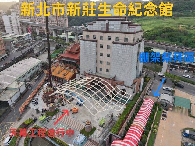 一、本市新莊生命紀念館前廣場天幕工程目前已上鋼構,後續會做薄膜及廣場地坪施工,目前有搭設臨時棚架在林蔭大道作為祭祀區供民眾使用(如照片所示)。